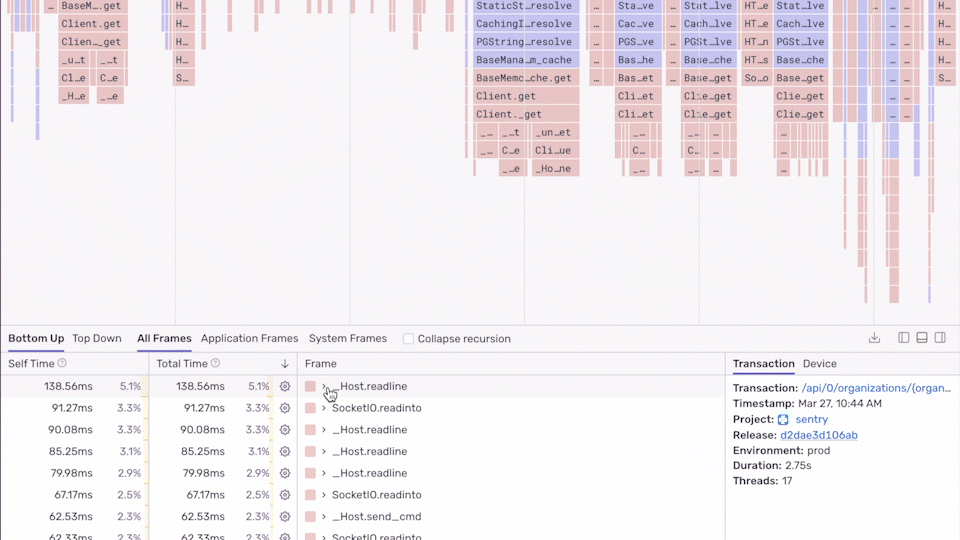 Flame graphs represent profile data with leaves either at the top or the bottom. This toggle lets you choose which visualization style your flame graphs default to.
